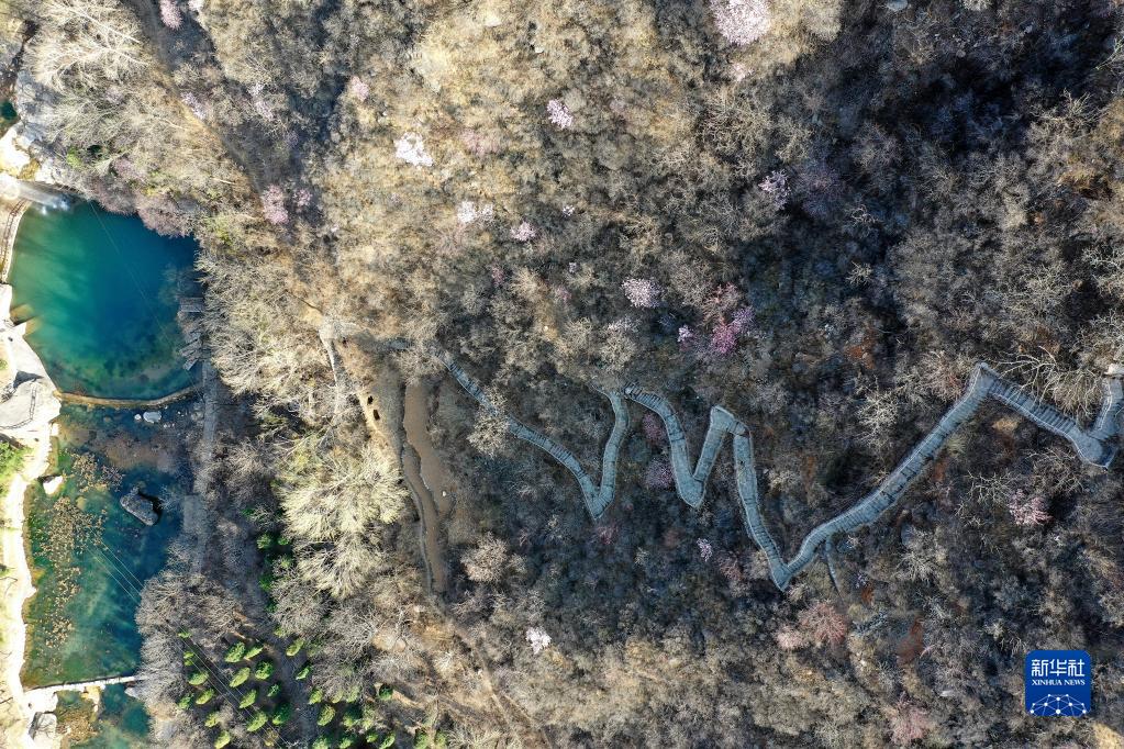 村民們走在修好的旅游步道上(2023年3月10日攝,無人機照片)。新華社記者 詹彥 攝
