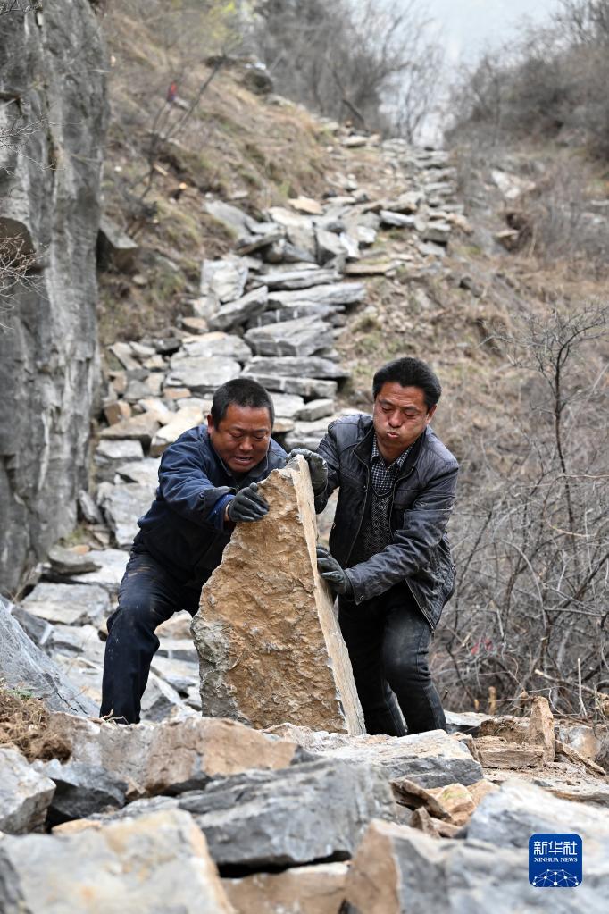 在山西省壺關(guān)縣大峽谷鎮(zhèn)青龍峽村,牛何松(右)和牛永剛在搬運石塊(3月23日攝)。新華社記者 詹彥 攝
