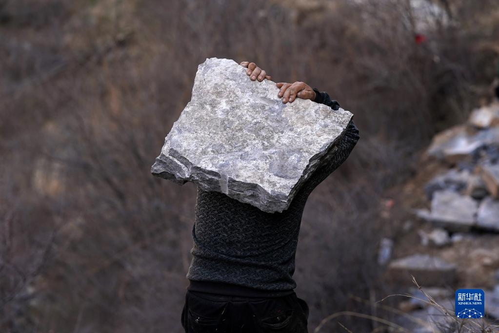 山西省壺關縣大峽谷鎮青龍峽村村民牛永剛在搬運石頭(3月7日攝)。新華社記者 詹彥 攝