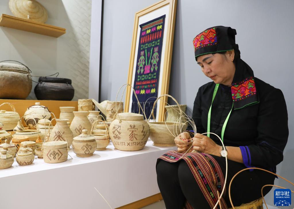 3月28日,黎族藤編非遺傳承人在展覽現場制作手工藝品。