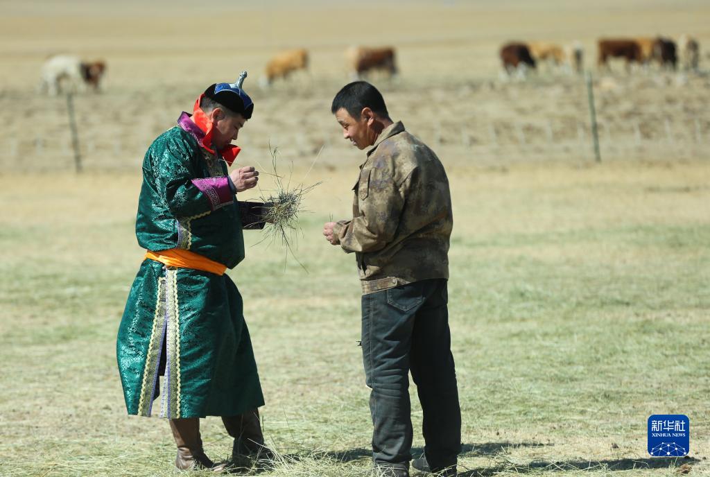3月28日,在巴彥額日和圖嘎查一戶牧民的草場上,一名嘎查黨員與牧民交流。