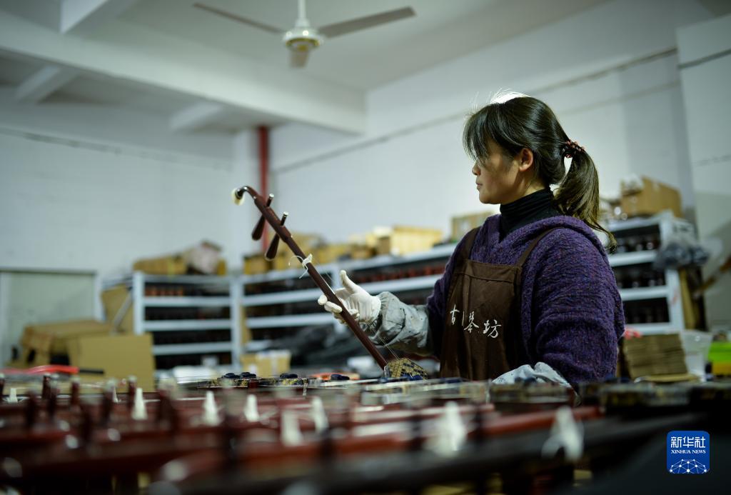 3月28日,在江蘇無錫梅村街道二胡產業園,工人在檢查二胡產品。