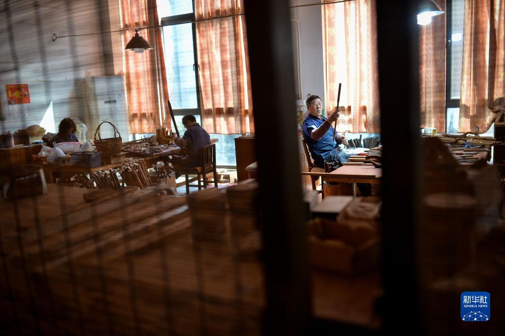 3月28日,在江蘇無錫梅村街道二胡產業(yè)園,工人在制作二胡。