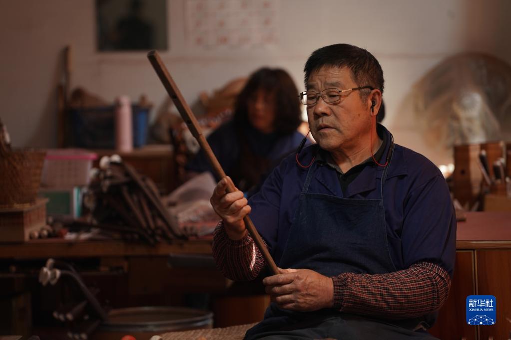 3月28日,工人在江蘇無錫梅村街道二胡產(chǎn)業(yè)園古月琴坊車間制作琴桿。