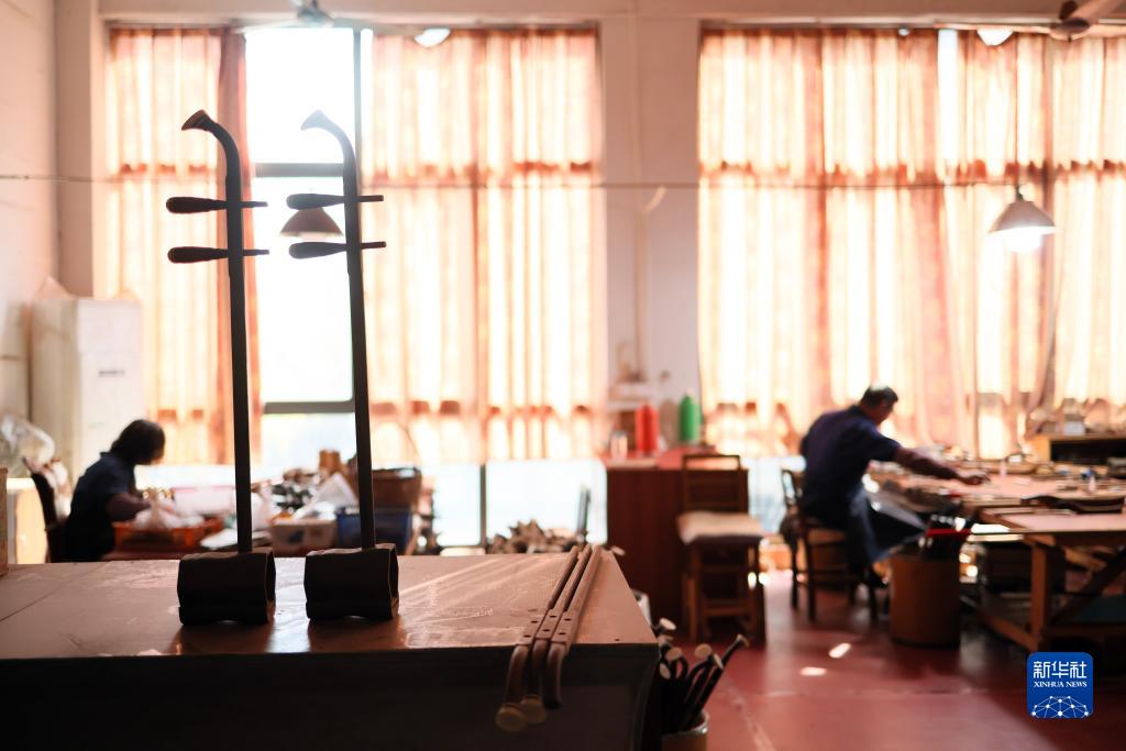 3月28日,在江蘇無錫梅村街道二胡產業園,工人在制作二胡。