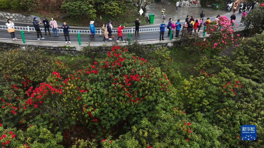 3月28日,游客在貴州省畢節市百里杜鵑風景區賞花(無人機照片)。