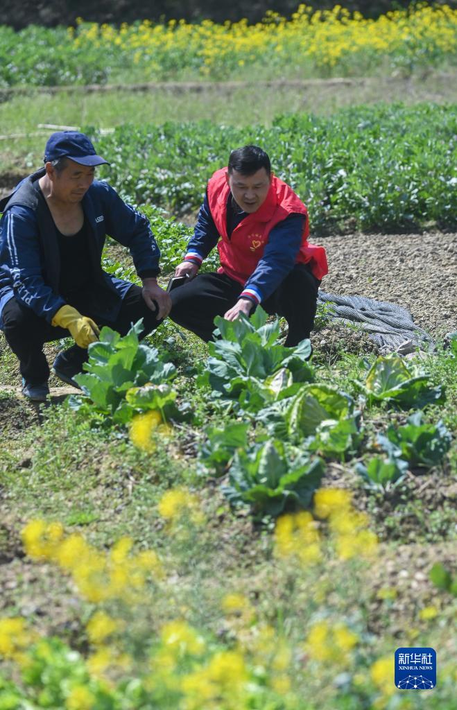 3月28日,杭州市臨安區昌化鎮后營村村黨支部副書記呂永(右)在菜地里和農戶交流,了解農戶種植及市場銷售情況。