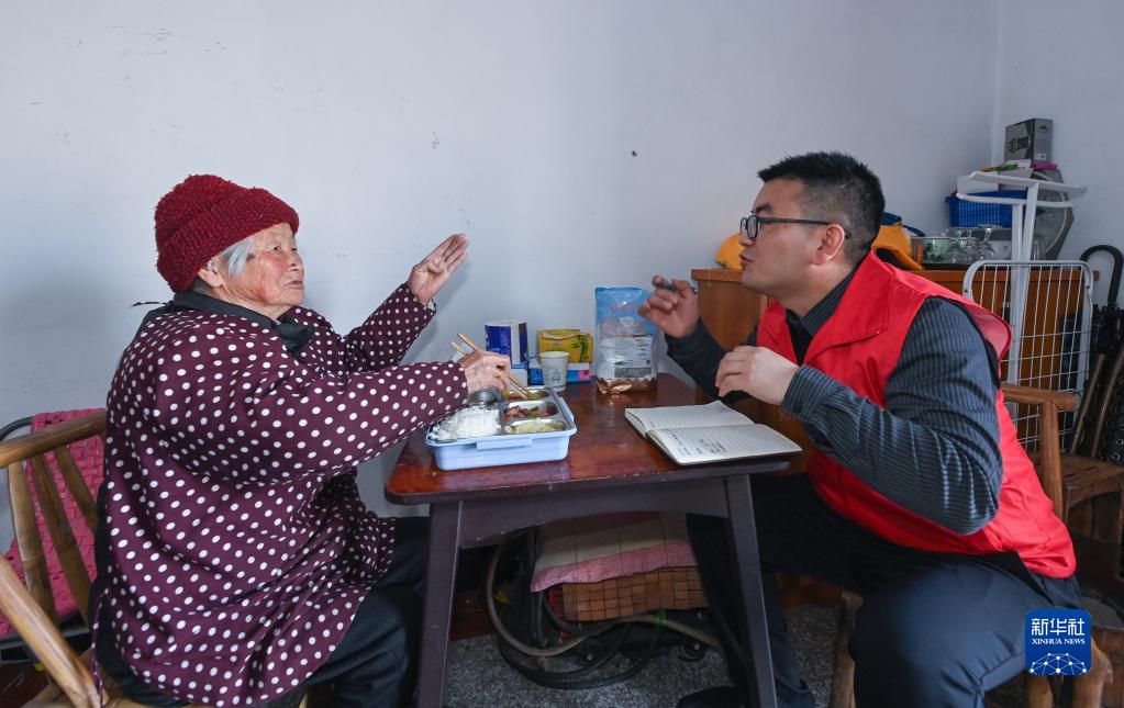3月28日,在杭州市臨安區昌化鎮聯盟村,網格黨員栗雪鋒(右)為90歲的獨居老人帥美珠送餐,并了解她當前的困難和需求。