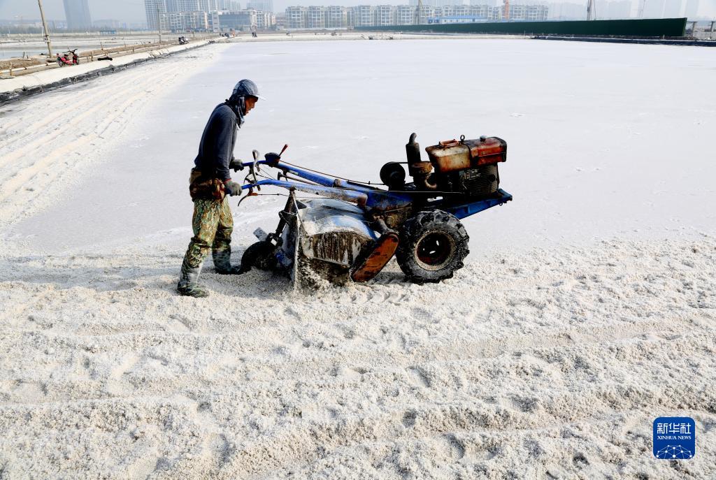 3月28日,在江蘇省連云港市大浦鹽田,工人操作機械在鹽田里進行破碴作業。