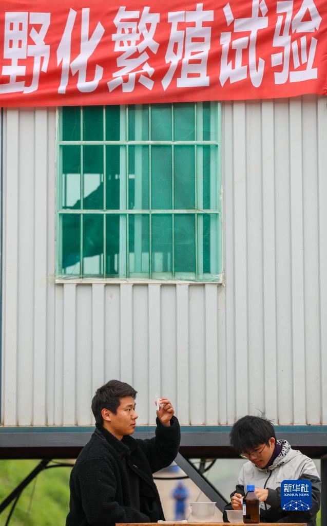 3月28日,在四川省宜賓市江安縣長江鱘野化繁殖試驗駐地,研究人員篩選長江鱘魚卵進行樣本固定。