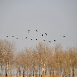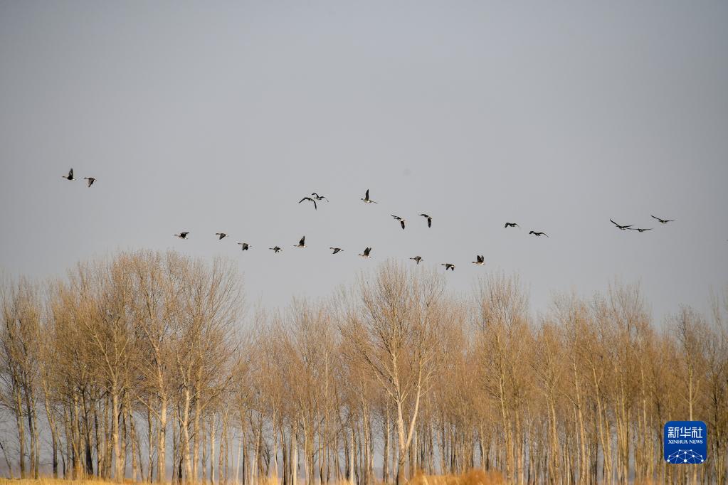 3月28日,在吉林省白城市鎮賚縣,一群豆雁從樹林上空飛過。