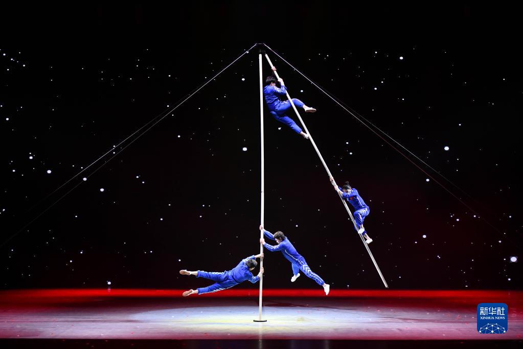 3月28日,在位于山東省濟南市的山東省會大劇院,演員表演雜技節目《逐夢空天·男女集體爬桿》。