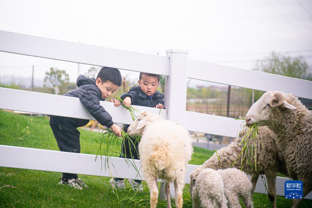 3月29日,小游客在諸暨市楓橋鎮(zhèn)杜黃新村的農(nóng)耕體驗研學基地喂羊。