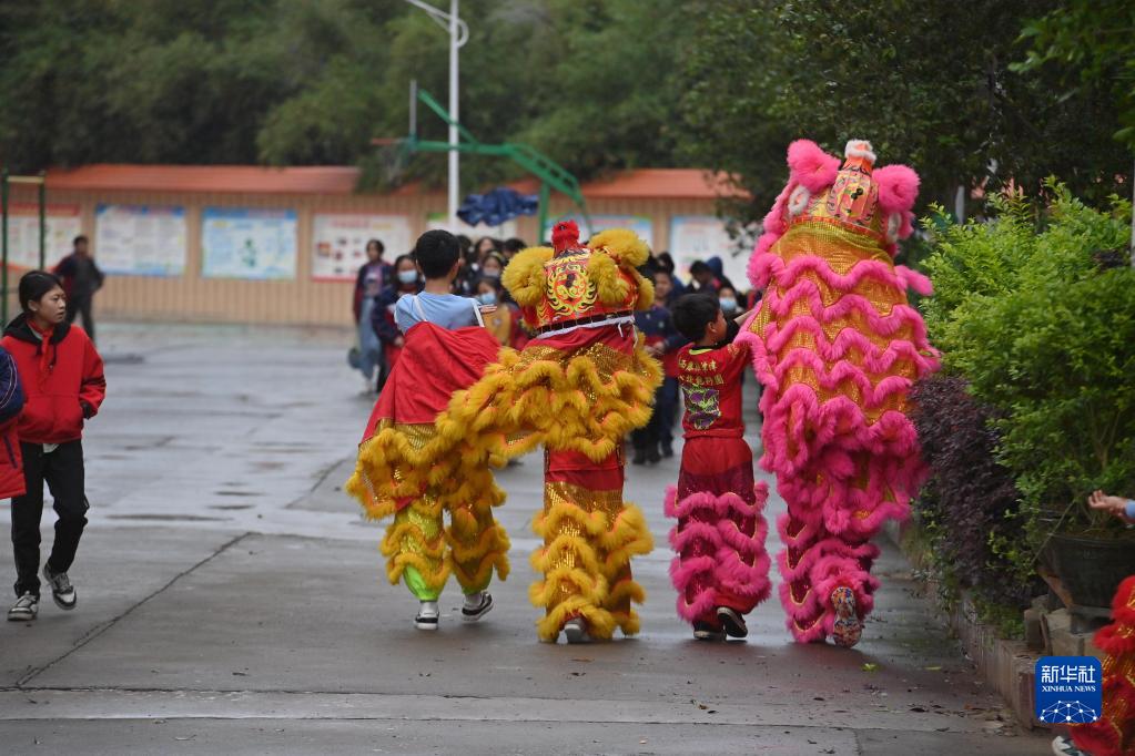 3月28日,在廣西梧州市藤縣潭津中心校,小學生們在舞獅訓練結束后返回教室。