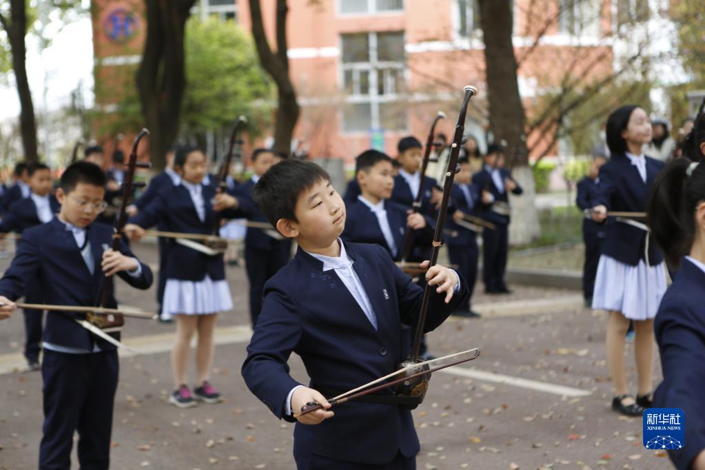 3月29日,江蘇無錫梅村實驗小學學生集體演奏二胡。