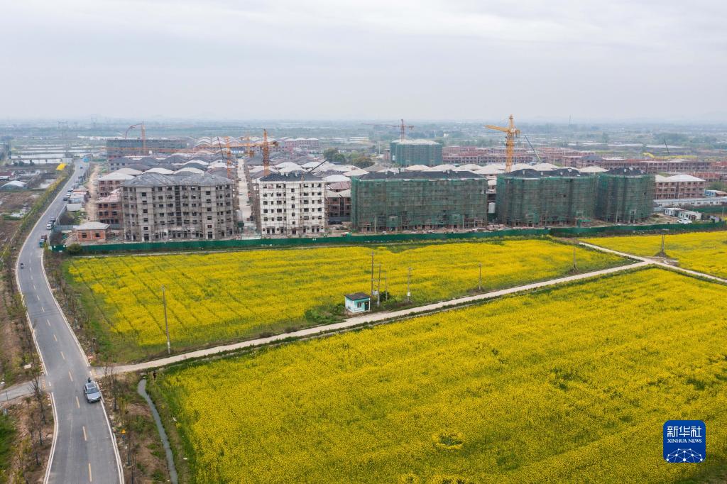3月29日拍攝的浙江省湖州市東林鎮(zhèn)星群村經(jīng)過土地綜合整治后建成的高標(biāo)準(zhǔn)農(nóng)田和正在建設(shè)的農(nóng)民新村(無人機(jī)照片)。