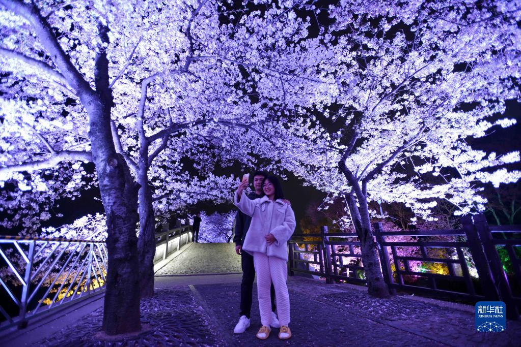 近日,江蘇無錫太湖黿頭渚景區里櫻花盛放,許多游客選擇夜賞櫻花,感受春天的浪漫。