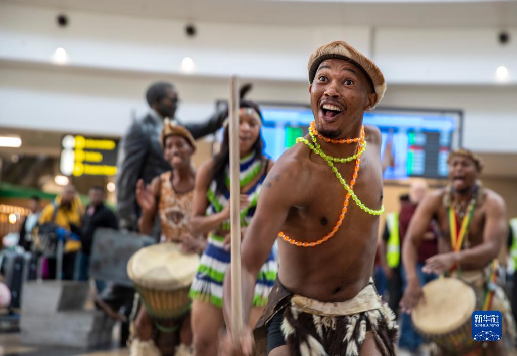 3月29日,在南非約翰內斯堡坦博國際機場,舞蹈演員在歡迎中國游客的儀式上表演。