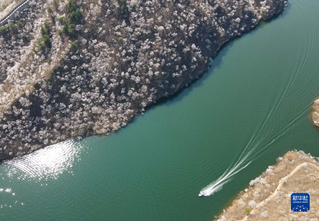 3月29日,游船行駛在黃花城水長(zhǎng)城腳下(無(wú)人機(jī)照片)。