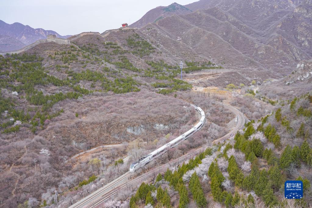 列車行駛在居庸關(guān)長城腳下(3月23日攝)。
