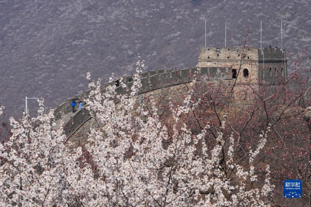 3月29日,游客在山花遍野的慕田峪長城景區參觀游覽。