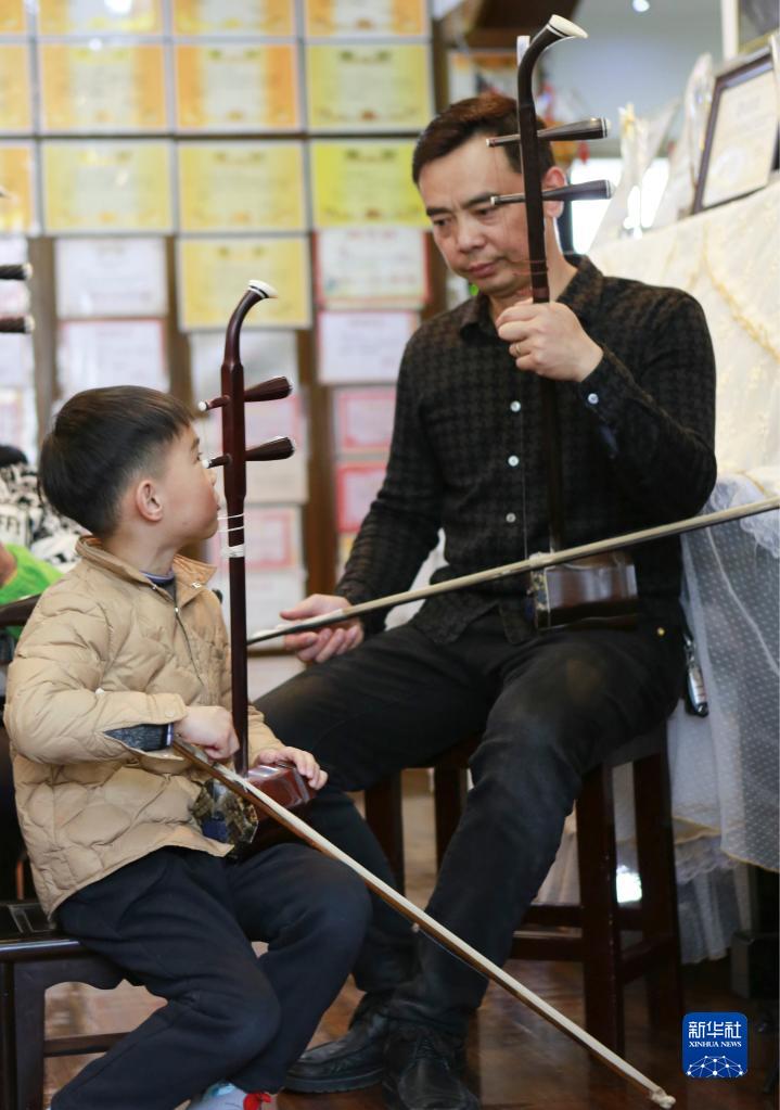 3月29日,錢鈞(右)教兒子錢智臣二胡演奏的技巧。