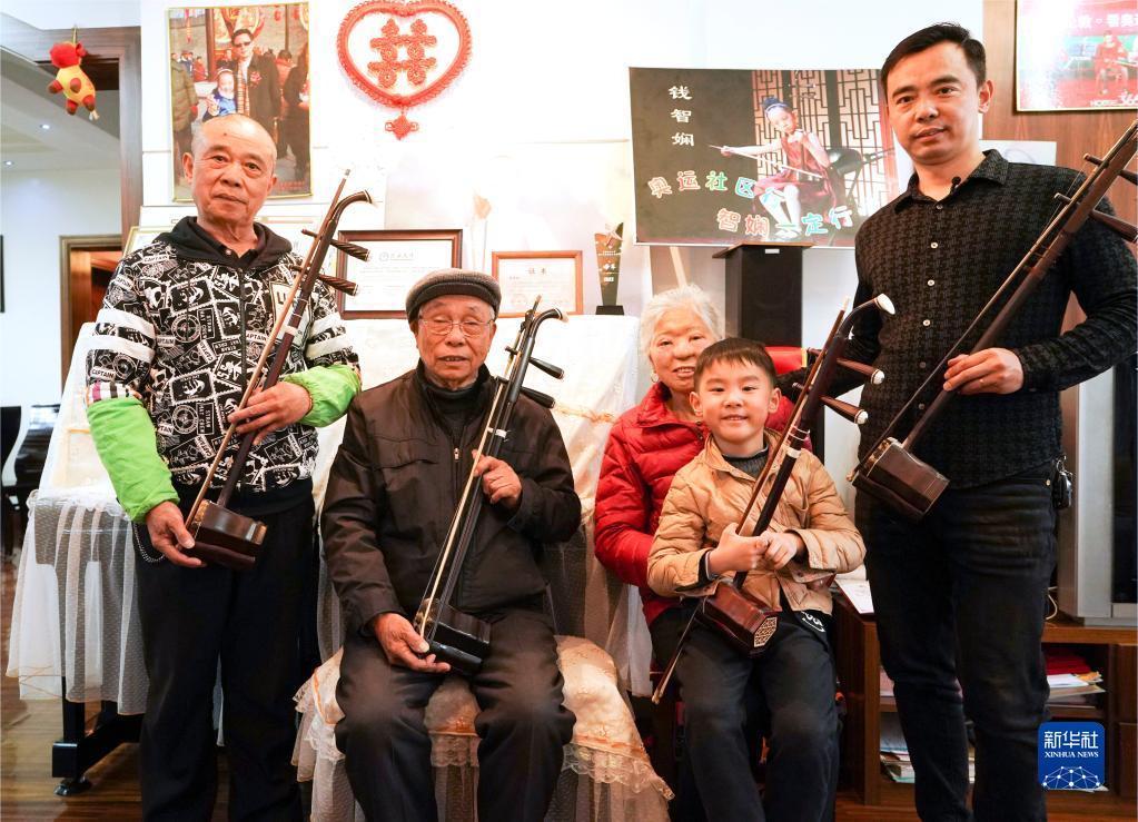 識譜、拉弦樣樣不懂,錢福基四處討教,然后回家摸索練習,慢慢掌握二胡演奏技巧。受他的影響,兒子錢建平也愛上了二胡演奏。生活條件越來越好,孫子錢鈞在女兒錢智嫻5歲時便開始請專業二胡老師授課,父女倆一起學習,共同提高。2019年,錢智嫻獲得第四屆“敦煌杯”中國二胡演奏比賽非職業少年B組金獎。如今,錢鈞7歲的兒子錢智臣以姐姐為榜樣,也開始練習二胡。