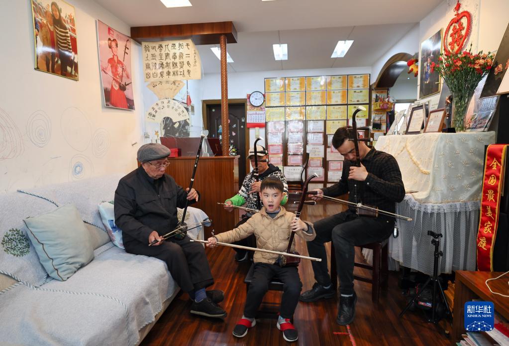 識譜、拉弦樣樣不懂,錢福基四處討教,然后回家摸索練習,慢慢掌握二胡演奏技巧。受他的影響,兒子錢建平也愛上了二胡演奏。生活條件越來越好,孫子錢鈞在女兒錢智嫻5歲時便開始請專業二胡老師授課,父女倆一起學習,共同提高。2019年,錢智嫻獲得第四屆“敦煌杯”中國二胡演奏比賽非職業少年B組金獎。如今,錢鈞7歲的兒子錢智臣以姐姐為榜樣,也開始練習二胡。
