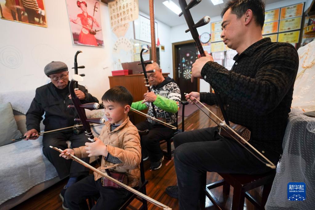 識譜、拉弦樣樣不懂,錢福基四處討教,然后回家摸索練習,慢慢掌握二胡演奏技巧。受他的影響,兒子錢建平也愛上了二胡演奏。生活條件越來越好,孫子錢鈞在女兒錢智嫻5歲時便開始請專業二胡老師授課,父女倆一起學習,共同提高。2019年,錢智嫻獲得第四屆“敦煌杯”中國二胡演奏比賽非職業少年B組金獎。如今,錢鈞7歲的兒子錢智臣以姐姐為榜樣,也開始練習二胡。