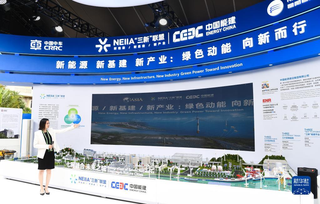 3月29日,中國能建參展人員介紹“新能源 新基建 新產業:綠色動能 向新而行”展臺。