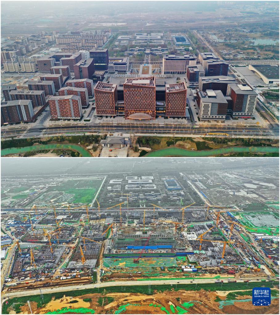 拼版照片:上圖為2023年3月31日拍攝的雄安新區商務服務中心(無人機照片);下圖為2020年8月13日拍攝的雄安新區商務服務中心建設現場(無人機照片)。