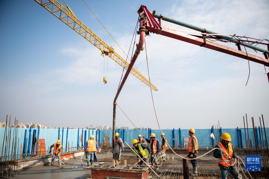 4月1日,在長沙岳麓山實驗室集聚區農大片區項目建設現場,工人在進行封頂施工作業。