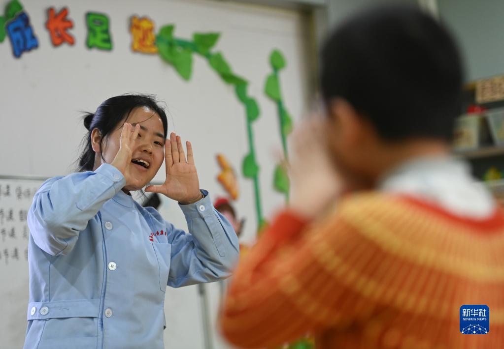 3月30日,在西安市金色陽光康復中心,特教老師(左)指導孩子進行康復訓練。