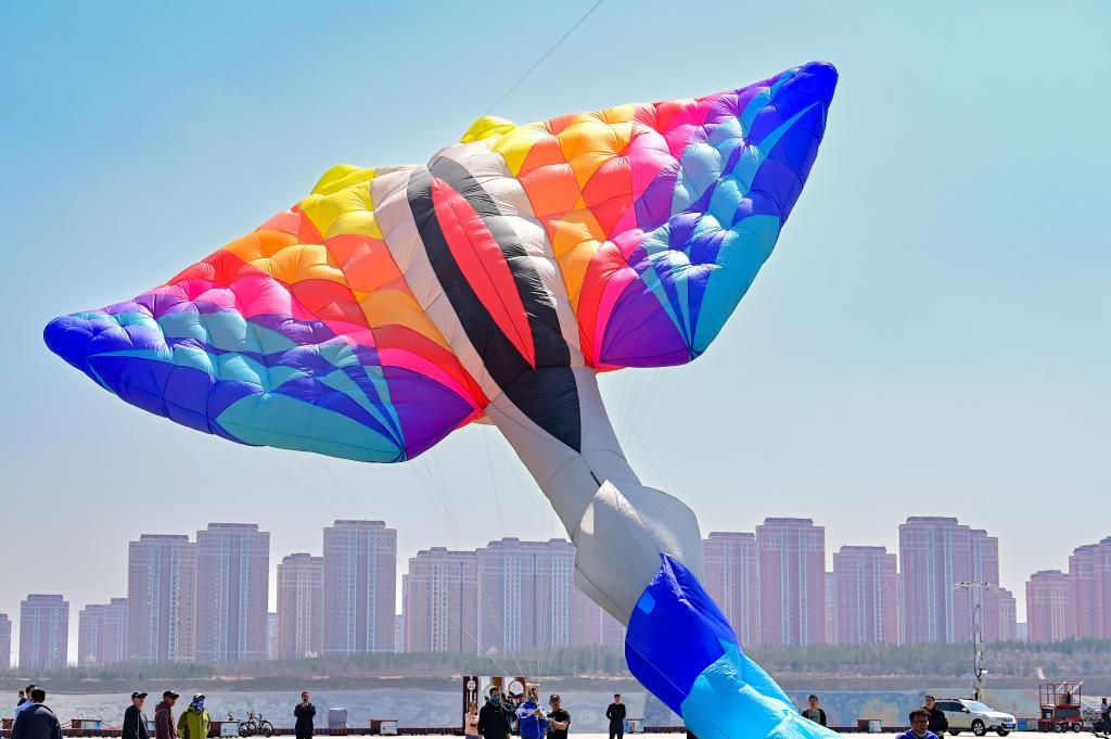 4月1日,風(fēng)箏愛好者在康巴什區(qū)亞洲雕塑藝術(shù)主題公園放飛軟體風(fēng)箏。