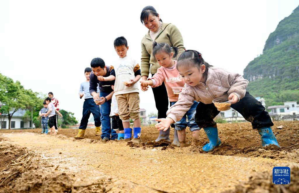 4月1日,在柳江區進德鎮龍新村龍朝屯,小朋友在家長陪同下學習播撒稻種。