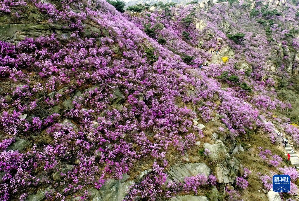 近日,山東青島西海岸新區大珠山萬畝野生杜鵑進入盛花期,漫山遍野的杜鵑花吸引游客前往賞花游玩,享受春光。