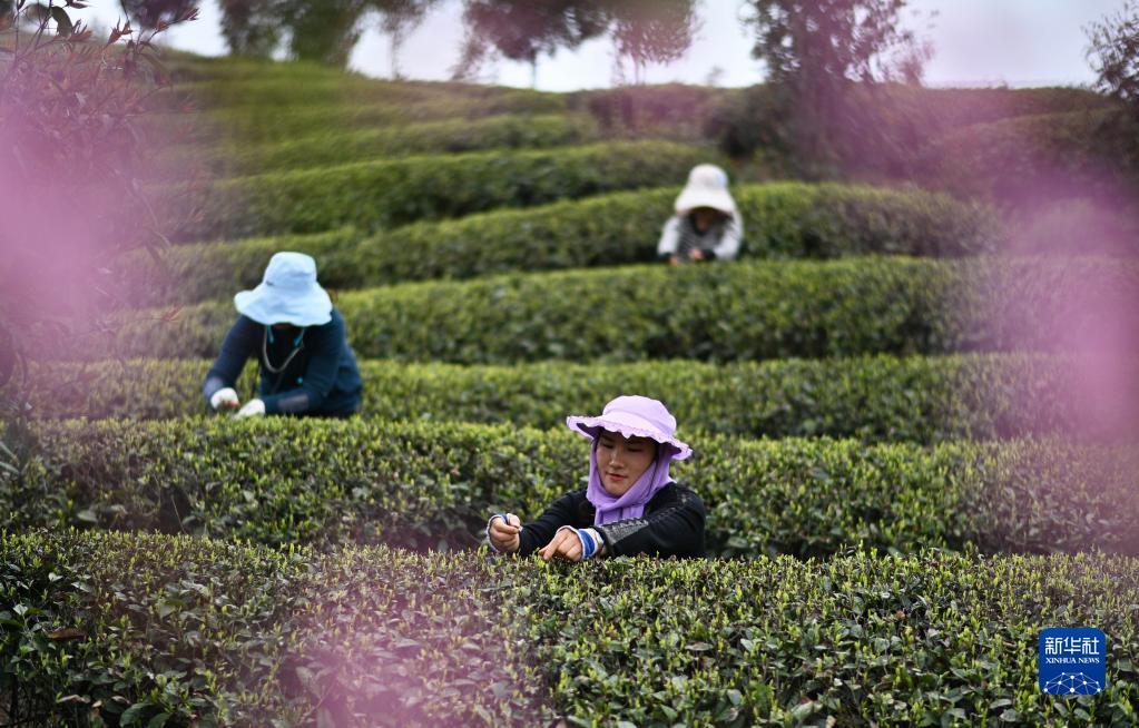 4月1日,村民在岑鞏縣天馬鎮(zhèn)一茶葉種植基地采摘明前茶。