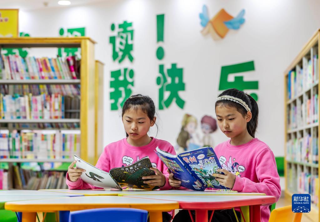 4月1日,一對孿生姐妹在貴州省黔西市圖書館少兒閱覽室閱讀圖書。