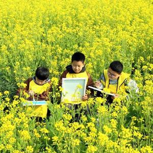 4月1日,在汝陽縣三屯鎮(zhèn)東保村千畝油菜花田,小學(xué)生坐在花叢中寫生。