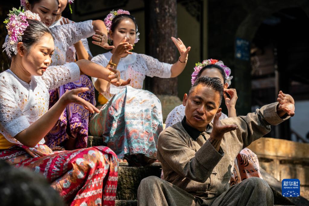 耿馬縣民族歌舞團團長王峰(右下)在和演員們交流舞蹈動作(3月23日攝)。