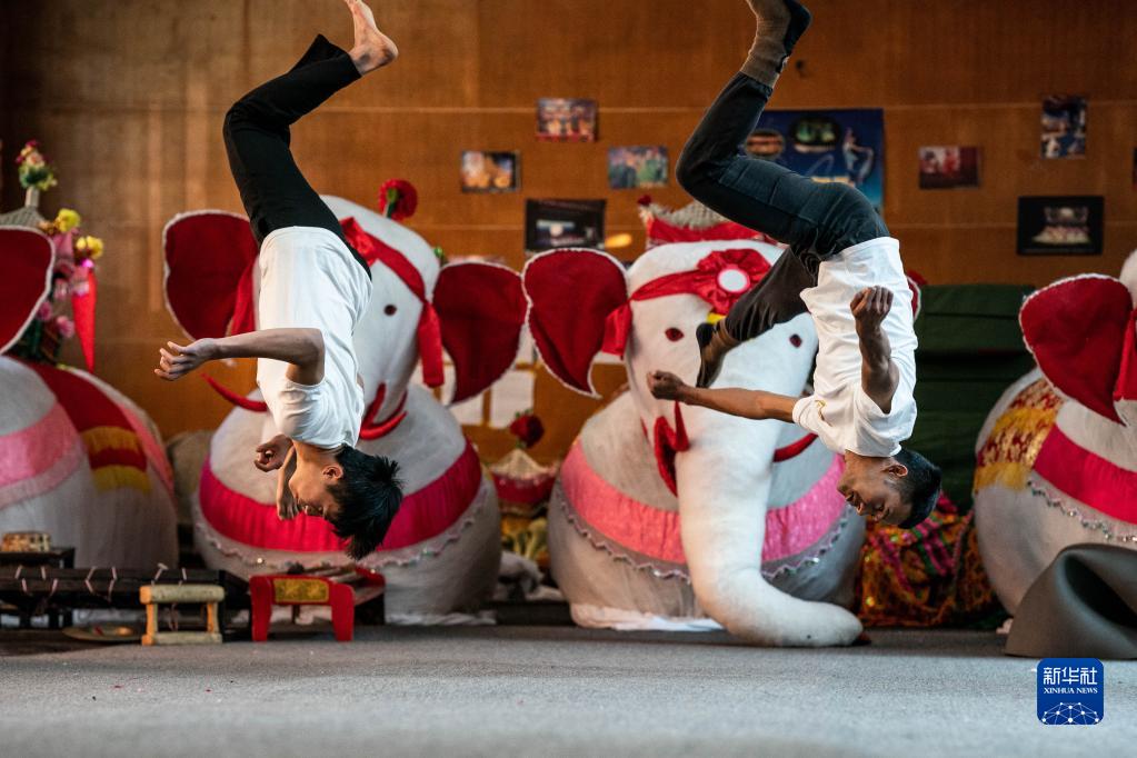耿馬縣民族歌舞團(tuán)演員巖平(左)、宰努思在練功房練習(xí)側(cè)空翻(3月23日攝)。