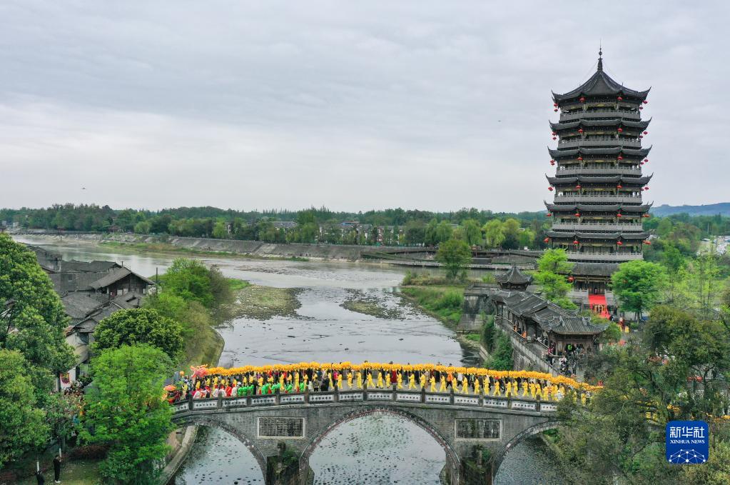 當(dāng)日,崇州元通清明春臺(tái)會(huì)在四川成都崇州市元通古鎮(zhèn)拉開(kāi)帷幕。由269人手舉269截龍身匯聚成的“匯江老龍”,在古街上巡游。