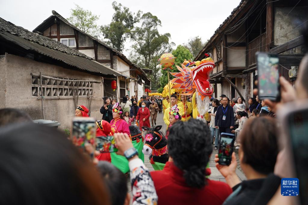 4月5日,游客在成都崇州市元通古鎮(zhèn)觀看“匯江老龍”巡游表演。