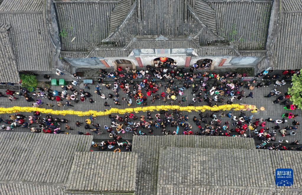 當日,崇州元通清明春臺會在四川成都崇州市元通古鎮拉開帷幕。由269人手舉269截龍身匯聚成的“匯江老龍”,在古街上巡游。