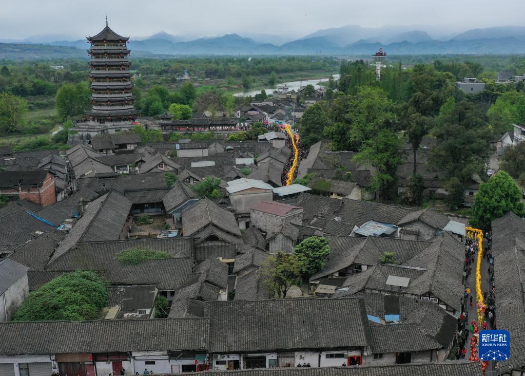當日,崇州元通清明春臺會在四川成都崇州市元通古鎮拉開帷幕。由269人手舉269截龍身匯聚成的“匯江老龍”,在古街上巡游。