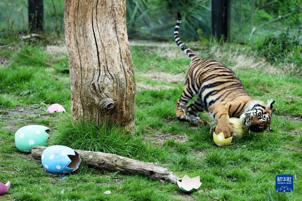 4月5日,在英國倫敦動物園,一只蘇門答臘虎享用“彩蛋大餐”。