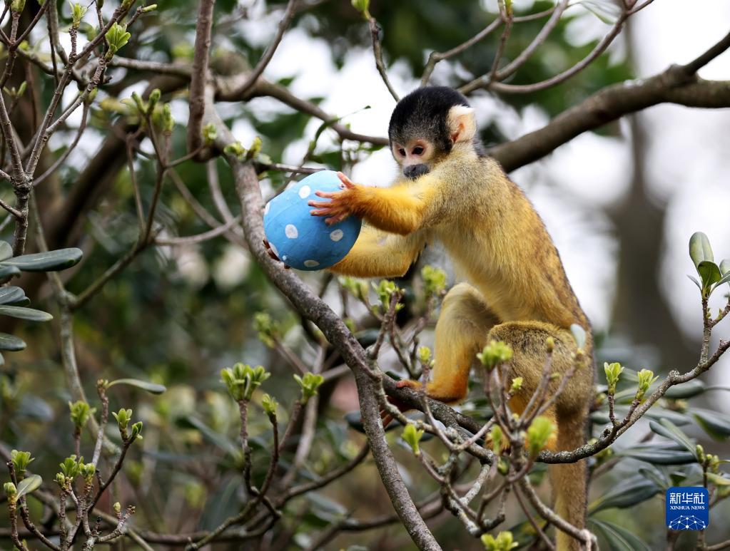 4月5日,在英國倫敦動物園,一只松鼠猴準備享用“彩蛋大餐”。