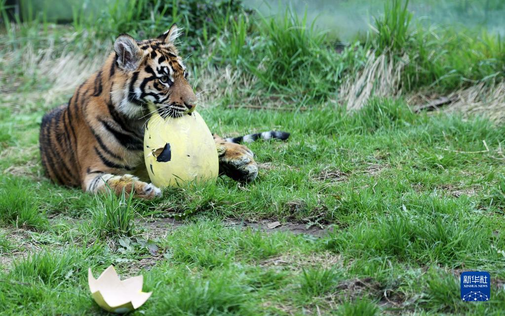 4月5日,在英國倫敦動物園,一只蘇門答臘虎享用“彩蛋大餐”。