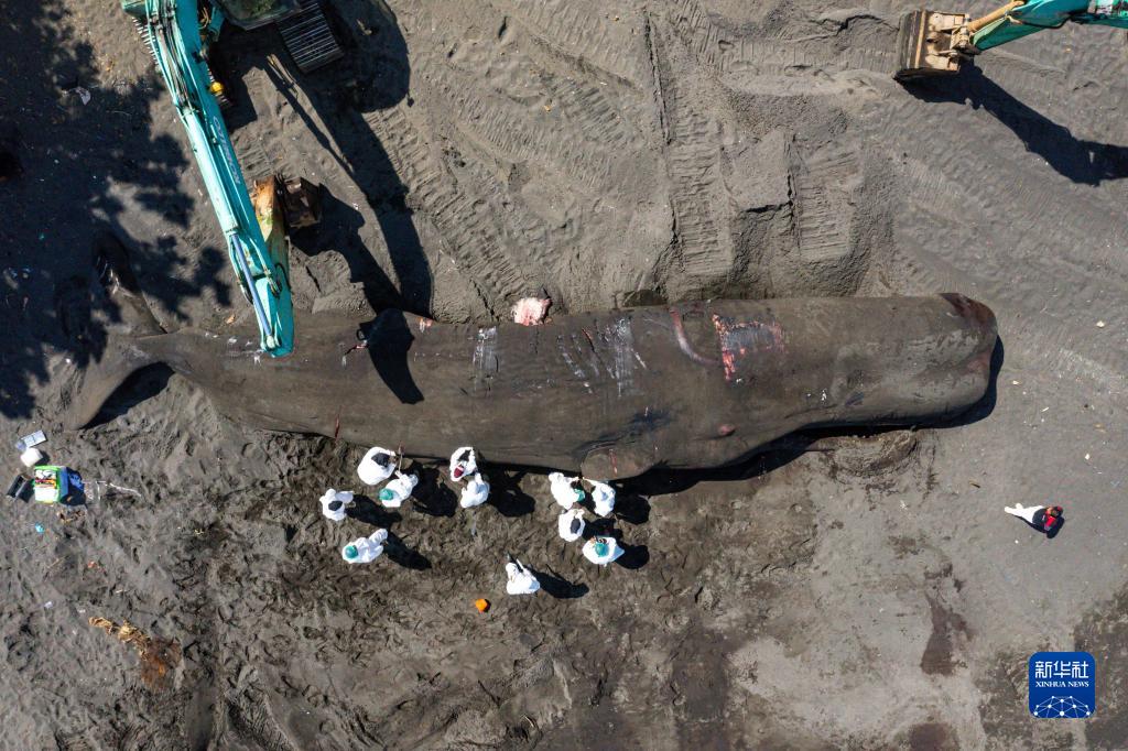 4月6日,在印度尼西亞巴厘島克隆孔,工作人員對抹香鯨的遺體進行醫學檢測(航拍照片)。