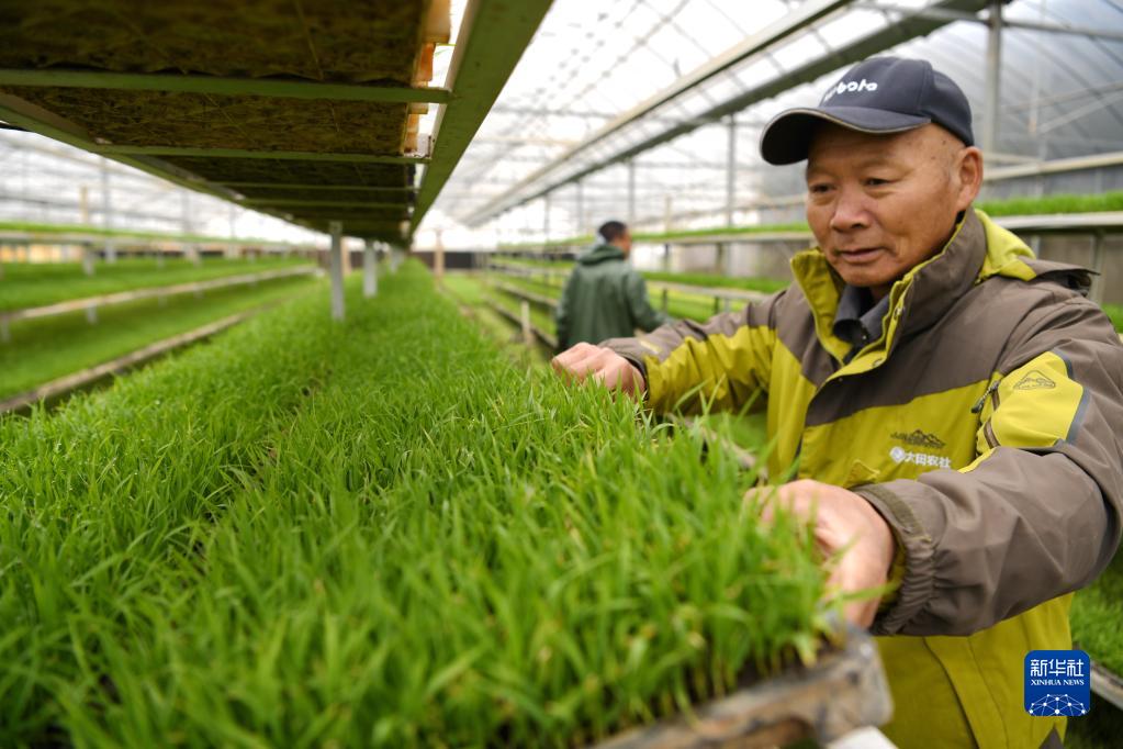 4月6日,在江西省南昌縣蔣巷鎮大田農社,育秧大棚內工作人員根據秧苗長勢進行移盤。